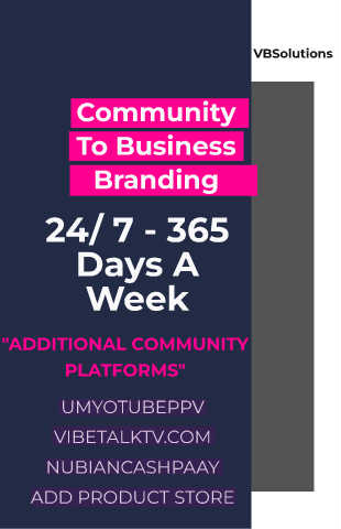 VBSolutions Community 24/ 7 - 365 To Business Days A Branding Week "ADDITIONAL COMMUNITY PLATFORMS" UMYOTUBEPPV VIBETALKTV.COM NUBIANCASHPAAY ADD PRODUCT STORE